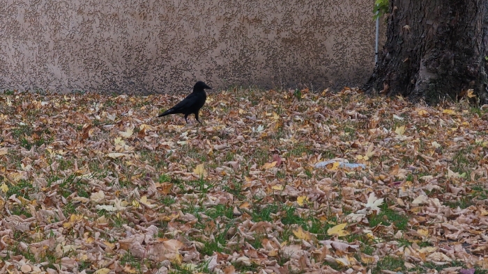 - "This scene, located in Mons-en-Barœul, France, presents a single, dark-colored corvid, consistent with a crow or raven, standing on a ground surface predominantly covered with fallen deciduous leaves" by FM-rzGlV2, licensed under CC BY 4.0