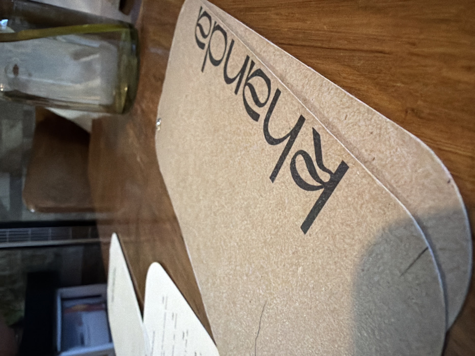 The image captures a close-up, slightly elevated perspective of a restaurant menu or folder resting on a polished wooden table. The menu is made of light brown, textured cardboard, prominently displaying the word "Khanda" in stylized black lowercase letters across its front. It consists of multiple sheets or panels fastened together at the top center with a small, metallic brad. The wooden table surface exhibits a warm brown hue with visible grain. In the blurred background, a partial white document or menu is visible to the left, while a clear glass bottle, possibly containing a green plant stem, stands on the table to the right. An indistinct brown chair is visible behind the table in the mid-background. No individuals are present in the scene, and no specific actions are depicted. The identifiable text "Khanda" indicates the location as "Khanda Cocina de la India," a restaurant situated in León, Guanajuato, Mexico.