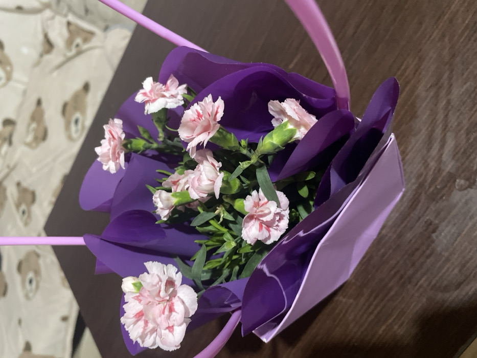A small bouquet of light pink and white carnations, some exhibiting red streaks, is centrally positioned. The flowers are arranged within dark purple paper or plastic wrapping, which is further encased by a lighter lavender-pink paper-like structure. A thin, light pink ribbon or handle extends upwards from the sides of the wrapping. Green foliage and several unbloomed flower buds are visible among the open blossoms. The bouquet rests on a dark brown, possibly wooden, surface. The background is out of focus, revealing a light-colored fabric patterned with repeated light brown figures resembling teddy bears. The scene is an indoor setting in the city of Saedinenie, Bulgaria. No individuals are present, and no specific actions or interactions are depicted.