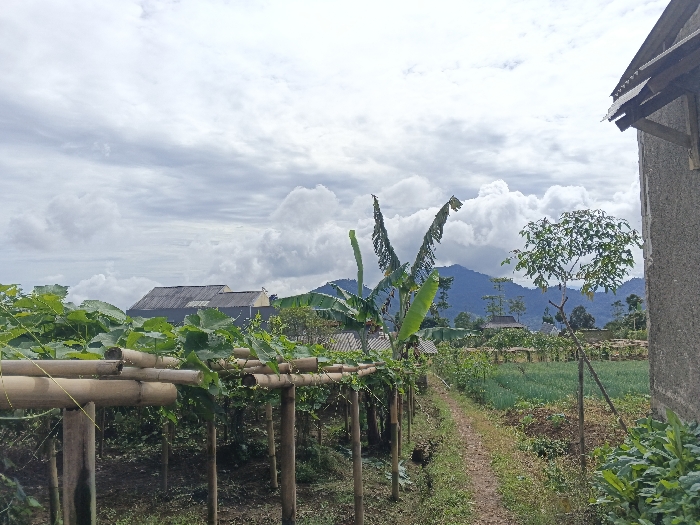 A rural landscape features a small farm. A bamboo structure supports climbing plants in the foreground, while a dirt path leads through a field of crops. In the background, mountains rise under a cloudy sky. A house stands to the right, partly visible, and another building is visible beyond the field. Banana trees and other vegetation dot the scene.