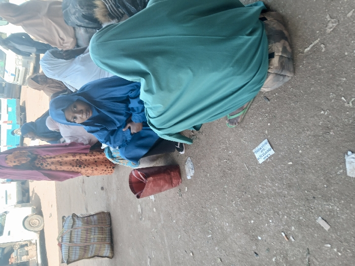 The image depicts an outdoor scene at a transportation hub in Plumtree, Zimbabwe. Approximately ten individuals, predominantly women, are gathered on a dusty, unpaved ground scattered with litter, including cigarette butts and a small, crumpled piece of handwritten paper. Most individuals are seated, dressed in modest, loose-fitting garments and head coverings. In the immediate foreground, a person with their back to the viewer wears a green dress and sandals, seated on a patterned cushion. Adjacent, a young woman in a blue jilbab and matching head covering sits on the ground, looking directly towards the camera with a neutral expression. A red cylindrical container and a large striped woven bag are also visible on the ground nearby. Further back, several other individuals in varied attire (white, brown, orange, light pink) are seated or standing. The background features multiple vehicles, including white minibuses and a blue and white bus, consistent with a bus or taxi rank. No overt interactions are observable between the subjects.