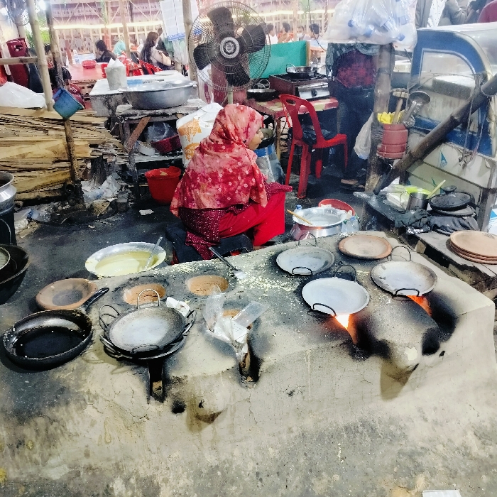 A woman wearing a red and white headscarf sits preparing food at a makeshift outdoor cooking station. Various cooking pans are arranged over holes in a concrete or clay platform where fires are burning. A bowl of batter sits nearby. Other cooking utensils, a fan, chairs, and various containers surround the cooking area, which appears to be at an outdoor market or event. Additional people are visible in the background, seated at tables.