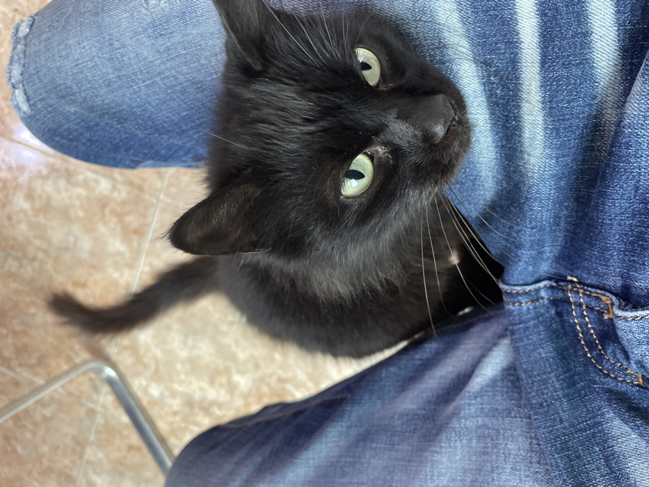 - "A black domestic cat with luminous green eyes occupies the central foreground, positioned between the spread legs of an individual wearing faded blue denim jeans" by FM-rrGIs2, licensed under CC BY 4.0