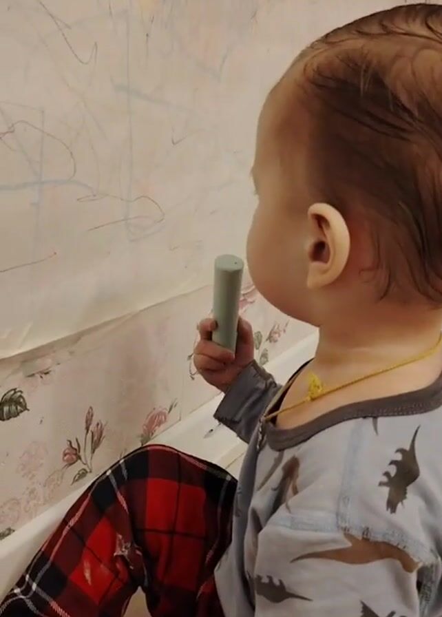Here is a detailed description of the video: The video features a young child, likely a toddler, sitting in a bathtub and drawing on the wall. The child has wet brown hair and is wearing a gray, long-sleeved shirt with a pattern of brown dinosaur-like figures, paired with red and black plaid pants. A thin gold necklace is around the child's neck. The child is holding a cylindrical, light green object, which appears to be a crayon or a similar drawing tool, in their right hand. The child is facing the wall and drawing scribbles on it. The wall is light in color and already covered with existing scribble marks. Below the wall, there's a section with floral wallpaper, featuring pink flowers. The child seems focused on the drawing activity, pressing the drawing tool against the wall. The camera angle is from behind and slightly to the side of the child, offering a clear view of their profile and the wall they are drawing on.