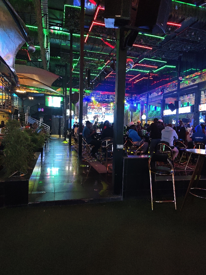 An indoor venue with various patrons seated at tables or the bar. A stage area is visible in the background, possibly for a performance or a sporting event being broadcast. The ceiling is adorned with multiple light fixtures, including neon lights, and a disco ball is observed. The floor reflects the lighting. Lush greenery decorates a section near the entrance.