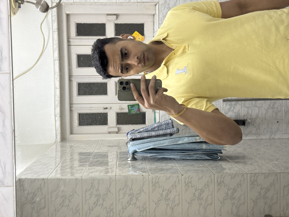 The image captures a male individual taking a mirror selfie in what appears to be a residential bathroom or washroom in Kolkata, India