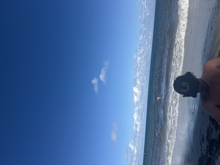 The image depicts a daytime beach scene located in Key Biscayne, United States. A vast expanse of clear blue sky occupies the upper two-thirds of the frame, featuring scattered white cumulus clouds primarily near the horizon and a few smaller formations higher up. The lower third of the image shows the Atlantic Ocean with dark blue-green water and white breaking waves meeting a sandy shoreline. Three individuals are visible in the ocean, engaged in wading or swimming activities. One person is positioned on the far left, partially submerged. Another person is located in the center-right, standing waist-deep in the water. A third person is further right, also partially submerged, and appears to be holding or interacting with a small orange object. In the immediate foreground, a shirtless individual is seated or reclining on the wet sand, facing slightly away from the camera with their head angled downward. This person is wearing a black baseball cap featuring an orange and green University of Miami "U" logo on the front. Patches of dark seaweed or debris are present on the sand in the foreground. The scene is illuminated by natural sunlight, indicating clear weather conditions.