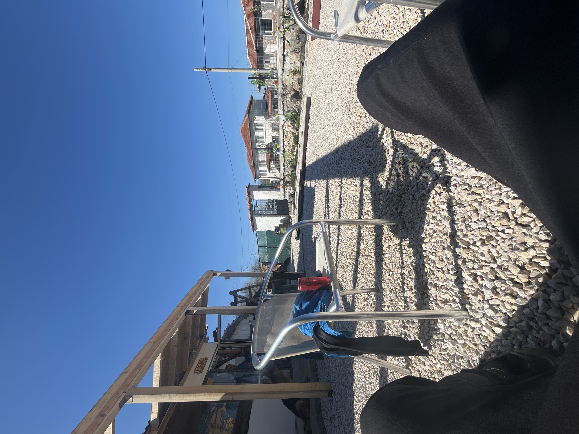 A person sits in a metal chair on a gravel surface in Goliamo Asenovo, Bulgaria. A blue cloth and a red container sit on the chair. Construction materials are visible to the left. Residential buildings are visible in the distance. The sky is clear and blue.