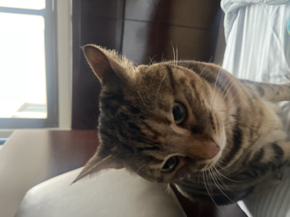A tabby cat with brown and black stripes peers inquisitively into the camera, its head tilted to one side