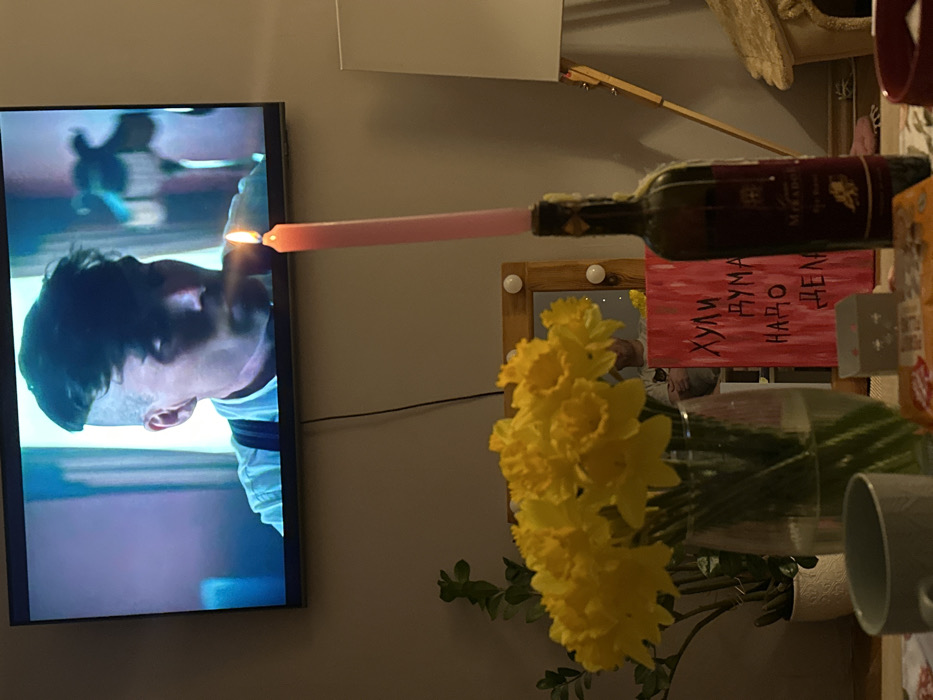A lit pink candle sits atop a wine bottle, appearing to ignite a man's face on a television screen. A vase of yellow daffodils partially obscures a mirror and a red sign with white lettering. A white mug and other items are visible in the foreground. The setting is a dimly lit room with various decorative items scattered around.