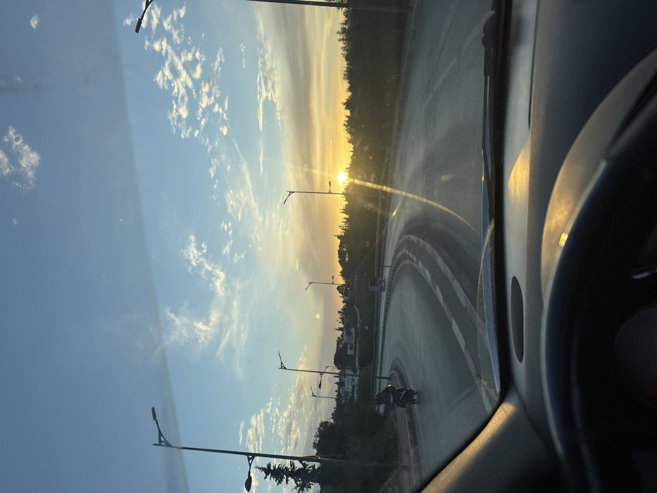 The image, taken from inside a vehicle, presents a road scene during sunset in Ouislane, Morocco