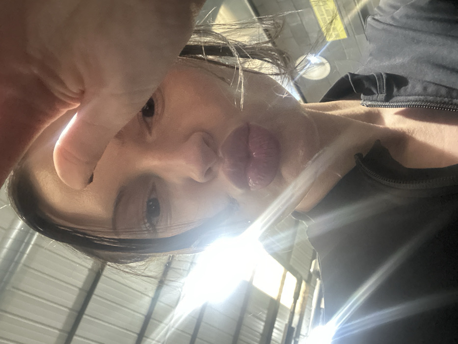 A female individual is captured in a close-up, upward-angled selfie, occupying the majority of the frame. She has dark hair, styled away from her face, and is looking directly at the camera with her lips pursed in a "kiss" or "duck face" expression. Her left hand, with a dark nail polish on the thumb, is partially visible in the upper right quadrant, slightly obscuring the top right portion of her head. She is wearing a dark, possibly black, zipped athletic top, with the zipper closure visible down the center of her chest. The background depicts an indoor environment characterized by a corrugated metal ceiling, indicative of an industrial or commercial building such as a warehouse or gymnasium. A strong light source, possibly a window or skylight, is present on the left side of the frame, generating significant lens flare across the image. Distant elements in the background include what appears to be a light-colored block wall and a circular fixture on the right side. The specific location within the city of Tonbridge and Malling, United Kingdom, cannot be determined from the visual information provided in the image.