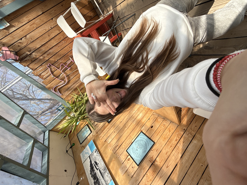 young female taking a selfie inside an establishment characterized by light-colored wooden interior finishes and a transparent roof system