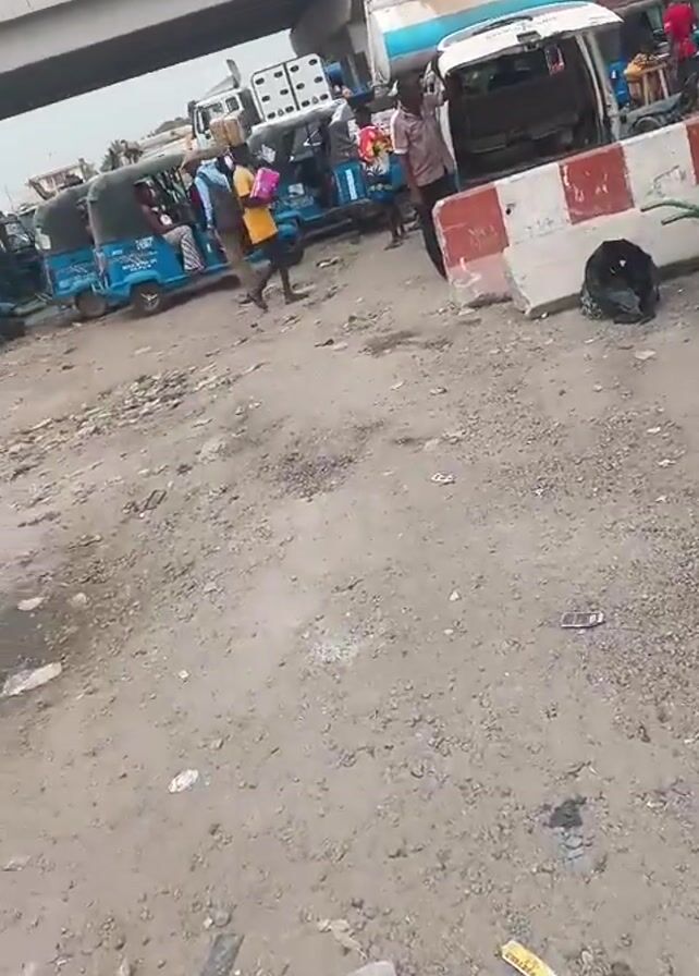 The scene captures an outdoor view, likely a bustling marketplace or transportation hub situated beneath a bridge or overpass. The foreground features a rough, unpaved ground littered with debris. A van with its rear door open is parked behind a set of red and white concrete barriers. People are seen moving about, some carrying goods, others interacting with vehicles and vendors. The vehicles present include blue auto rickshaws and large trucks. Overhead, a power line and a bridge structure can be seen. The overall atmosphere suggests a busy, somewhat chaotic environment.