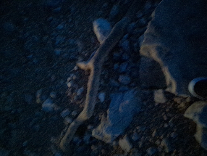 A close-up shot of a dark, stony ground illuminated by a faint blue light