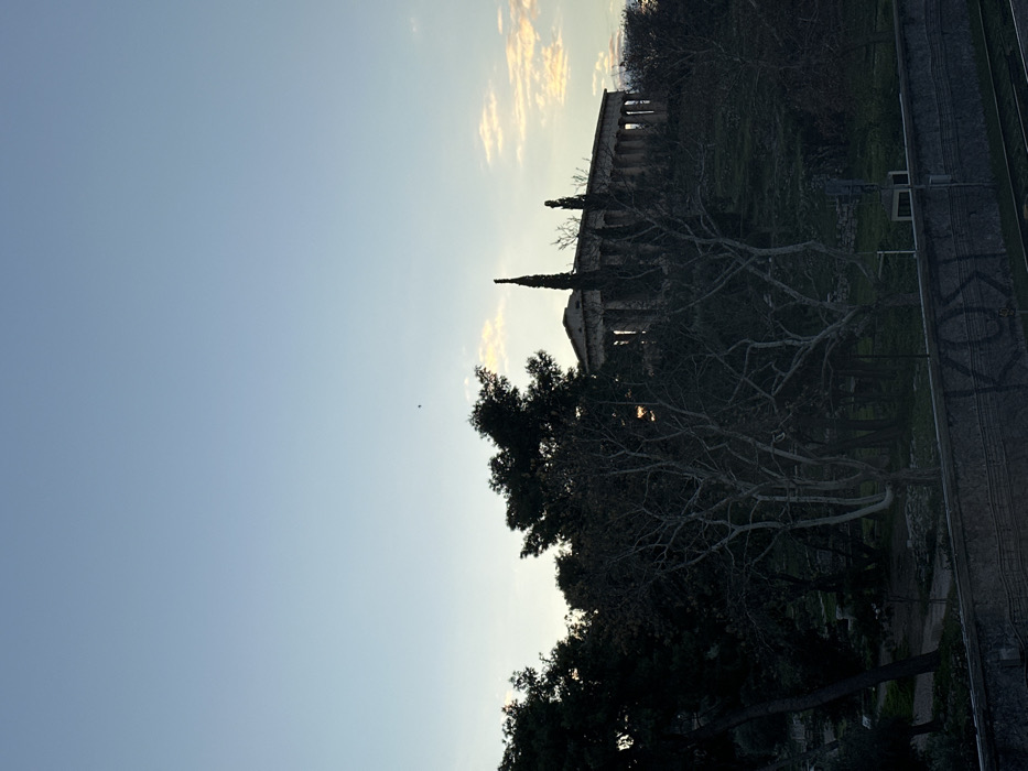 The image depicts the Temple of Hephaestus, situated on Agoraios Kolonos hill within the Ancient Agora of Athens, Greece. The scene is captured at either dawn or dusk, characterized by soft, low-angle light. The upper two-thirds of the frame reveal a clear, light blue sky, with a band of thin, wispy clouds displaying subtle yellow and orange hues along the right horizon. A small, dark, unidentified object is visible airborne in the upper-middle portion of the sky. The midground is occupied by a dense arrangement of trees and vegetation, largely silhouetted against the sky. Foliage density varies, with some trees showing bare branches while others are evergreen. The Temple of Hephaestus, a well-preserved Doric peripteral structure, stands prominently atop the hill, partially obscured by the surrounding trees. Two tall, dark, coniferous trees, resembling cypress, are positioned near the temple. Below the main tree line, a dirt path or trail winds through sparse greenery and scattered remnants of ancient ruins. In the foreground, a dark, horizontal retaining wall occupies the bottom fifth of the image. The wall's surface features graffiti, including a distinct "KOS" or similar letter sequence. Immediately below this wall, two parallel railway tracks are visible, extending horizontally across the frame. No human figures are present in the image.
