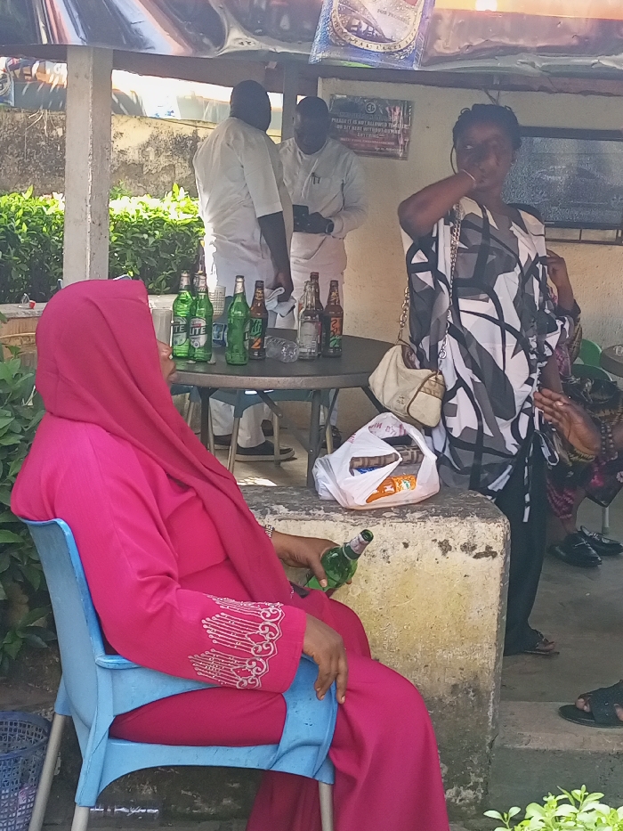 The scene portrays an outdoor social gathering in Akwanga, Nigeria. In the foreground, a woman in a deep pink hijab and matching long dress is seated in a light blue chair, holding a green glass bottle in her right hand. Her attire features intricate silver embroidery on the sleeves. To her immediate right, a weathered concrete ledge supports a white plastic bag containing an orange-wrapped item. In the mid-ground, a dark circular table holds a collection of approximately seven green and brown glass bottles, two clear plastic cups, and a white cloth. Behind this table, two men in light-colored, possibly traditional Nigerian, attire are standing. The man on the left faces away, while the man on the right, facing left, appears to be looking at or interacting with a small dark device held in his hands. To the right of the table, a woman in a black, white, and grey patterned caftan-style dress stands, carrying a light-colored handbag with a chain strap over her left shoulder. Her right hand is raised towards her mouth or face in a gesture. Partially visible on the far right are the lower legs and feet of another individual wearing dark sandals. The background features green foliage on the left and a light-colored, textured wall on the right. Overhead, a makeshift shelter provides shade, with banners or posters partially visible beneath it. The ground is a light-colored, possibly concrete, surface.