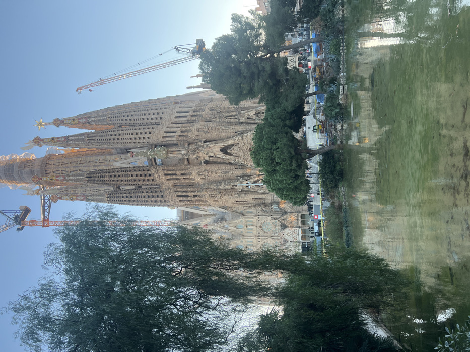 The Sagrada Familia dominates the scene, its spires reaching towards a blue sky