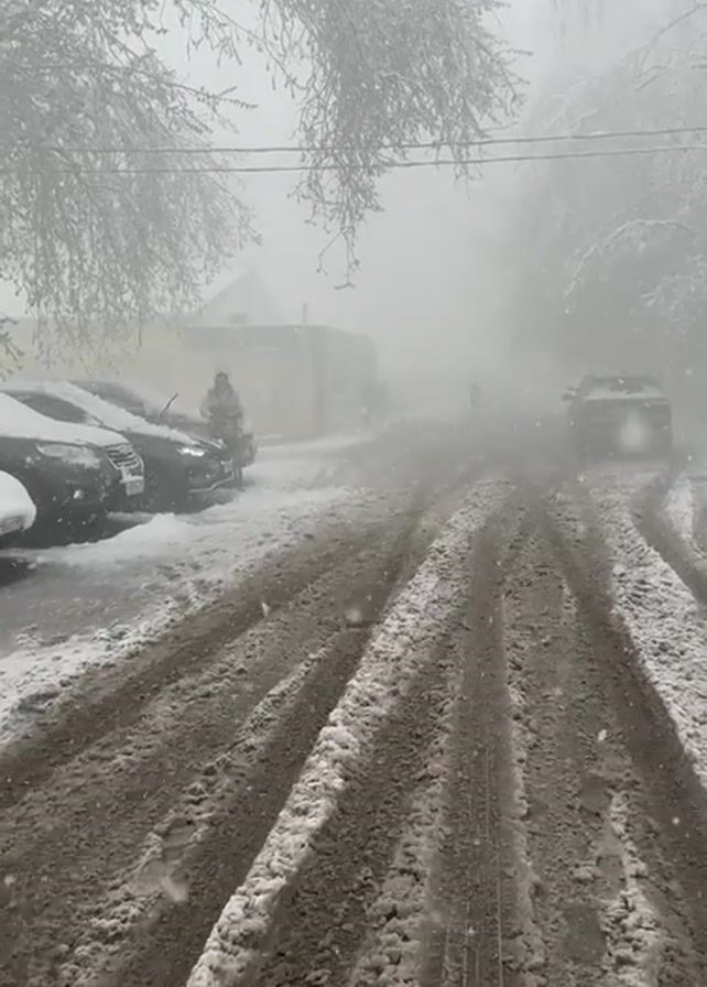 street covered in snow and slush during a heavy snowfall. Several parked cars are visible on the left side of the street, partially covered in snow. A few people can be seen walking in the distance, their figures obscured by the heavy snow. A dark SUV is parked further down the street. The road is marked with tire tracks in the slush and snow. Trees line the street, their branches coated in snow, adding to the overall wintry scene. Visibility is low due to the intensity of the snowfall.