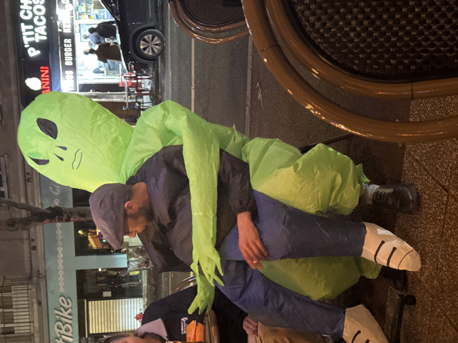 The image displays an outdoor night scene on Rue de l'Oratoire in Caen, France, adjacent to a "P'tit Ch'ti Tacos" restaurant. A male individual, wearing a dark flat cap, glasses, and a beard, is seated on a black wheeled chair. He is enveloped by a full-body, bright green, inflatable alien costume, which features prominent black eyes and a small mouth. The alien costume's large, cartoonish hands are wrapped around the man's torso. The man wears a dark jacket, dark blue trousers, and distinctive white, striped, boot-like foot coverings. His right hand holds a cigarette. To the far left, a portion of another person seated at a dark table is visible. The background includes the illuminated storefronts of the "P'tit Ch'ti Tacos" and a "TiBike" shop with a rolled-down shutter, a street with a black car partially visible, and overhead building elements. The scene is lit by artificial light sources.