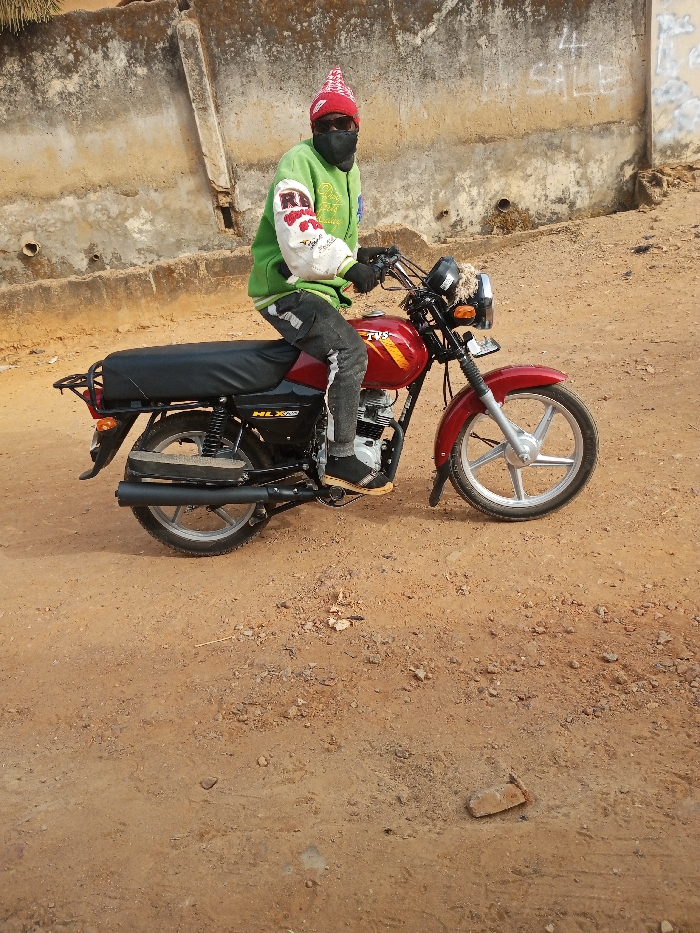 A man on a red and black motorcycle sits on a dirt road. He wears a red hat, black face covering, and a green jacket with white sleeves. The motorcycle is a TVS model. A weathered wall with graffiti is in the background. The ground is mostly dirt with small stones.