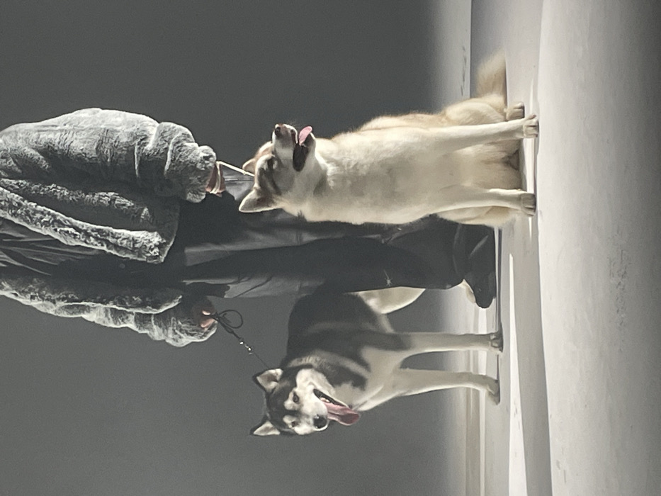 A person in a gray, textured coat and black pants stands next to two Siberian Huskies. The top Husky has cream-colored fur, with a black nose and visible pink tongue. The lower Husky is black and white, also with its tongue out. The person holds a leash connected to the lower dog. The scene has a slightly blurred, shadowed appearance with a pale, indistinct background, resembling a wall or large surface.