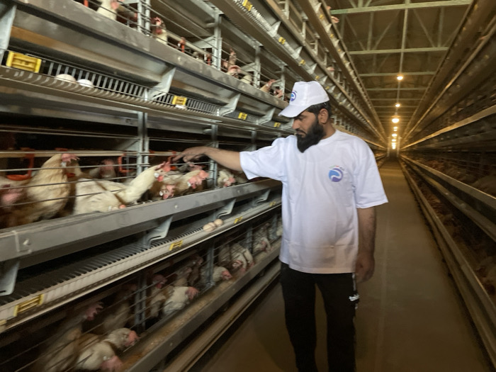 The image displays the interior of a commercial poultry farming facility located in Shuyene Vosta, Afghanistan
