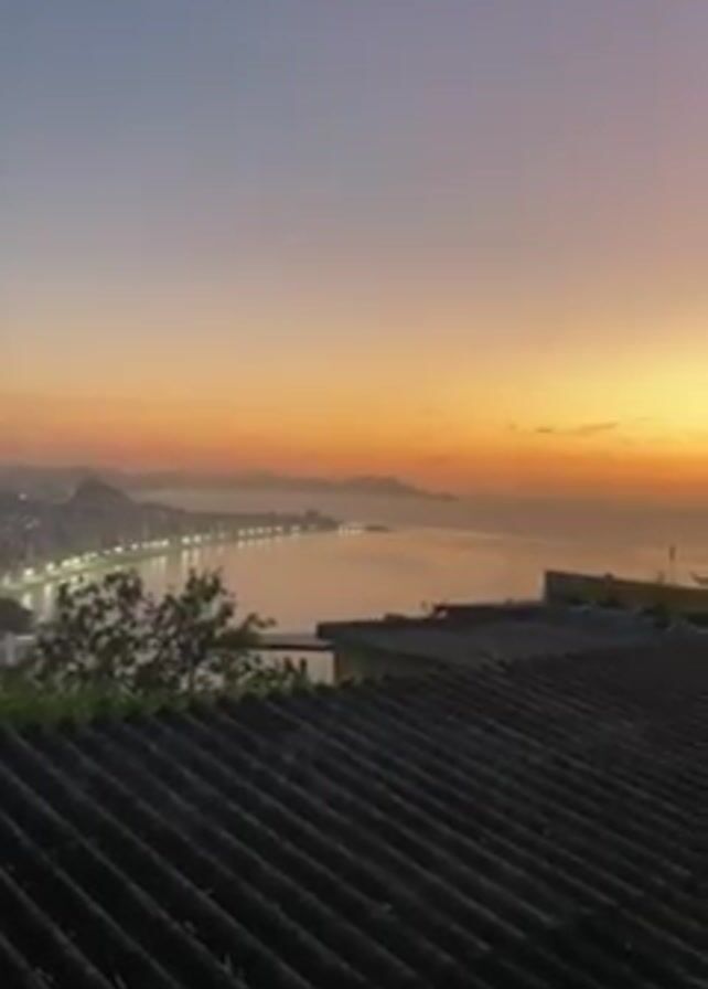 dawn or dusk view of a coastal city, likely Rio de Janeiro, Brazil. A corrugated iron rooftop occupies the lower foreground of the frame, suggesting the vantage point is from an elevated position. In the middle ground, a bay is visible, illuminated by city lights along the shoreline and a vibrant sunrise or sunset. The sky transitions from a deep blue at the top to shades of orange and yellow on the horizon. In the background, there are vague outlines of mountains or hills, common geological features in the Rio landscape. Music can be heard in the background.