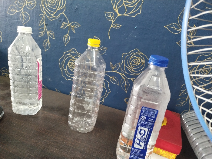 Three plastic water bottles sit on a wooden table. The bottle on the left is full of water, with a white cap. The middle bottle is empty, with a yellow cap. The bottle on the right is full of water and has a blue cap. The bottles are all in a rectangular shape, with a corrugated surface. There is a ceiling fan in the background. The bottles are in front of a blue wall with gold roses patterned on it. The scene is located at latitude 22.993 and longitude 72.587 in Ahmedabad, India.