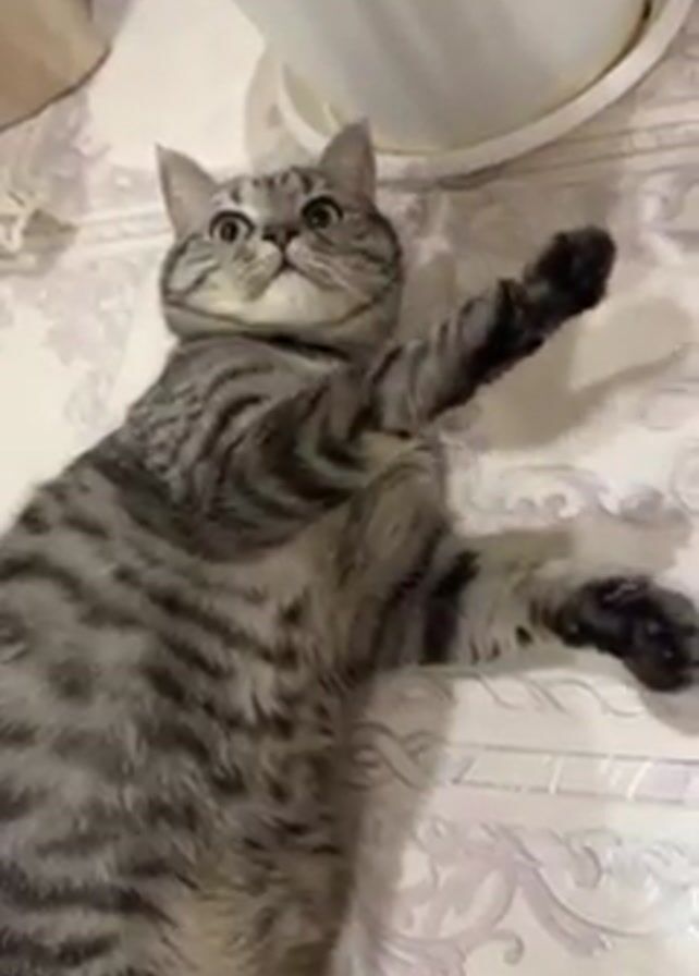 - "grey tabby cat lying on its back on a bedspread with a purple and white design" by FM-qGpE52, licensed under CC BY 4.0