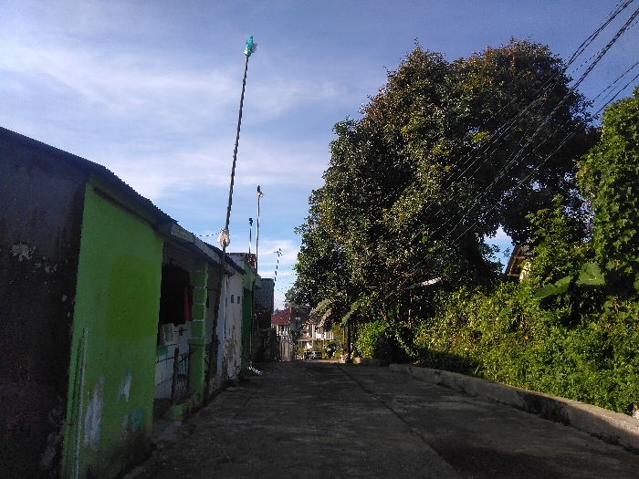 This image captures a paved uphill pathway or narrow road located in Beitostølen, Norway, under clear daytime conditions. On the left side of the frame, a row of single-story structures is visible, with the nearest building exhibiting peeling bright green paint and a dark, recessed window or doorway. A tall, slender pole, topped with a light-colored plastic bottle, extends vertically from near this building. Further along the left, additional weathered buildings, some painted white, line the pathway. The right side of the scene features a low concrete curb separating the pavement from dense green vegetation, including overgrown bushes and large mature trees. Multiple dark utility wires are strung across the upper right portion of the image, partially interwoven with the tree canopy. The paved surface is dark, displaying areas of sunlight and shadow. The sky above is clear blue with sparse white cirrus clouds. No individuals, animals, or vehicles are present.