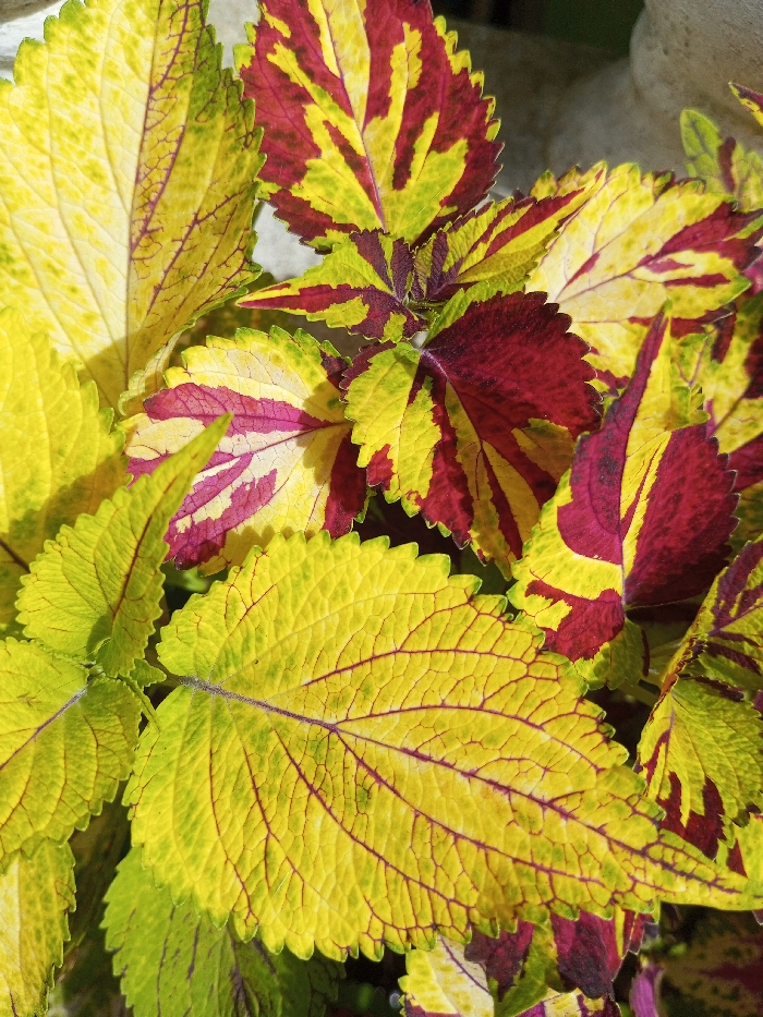 - "The image displays a detailed close-up of variegated Coleus plant foliage, filling the entire frame" by FM-25tUC3, licensed under CC BY 4.0