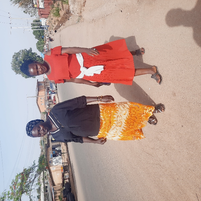 Two women walk down a paved road in the city of Kufang, Nigeria. The woman on the left wears a black blouse and a long yellow and white skirt. She wears sandals. The woman on the right wears a red sleeveless dress with a white sash and sandals. They are walking in the same direction, and the woman on the right appears to be carrying a purse. The road has a sandy surface, and there are buildings on both sides. The sky is blue and clear, and the sun is shining. There is vegetation on the sides of the road.