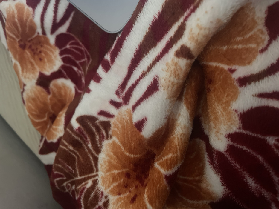A close-up shot of a plush floral blanket reveals a complex pattern