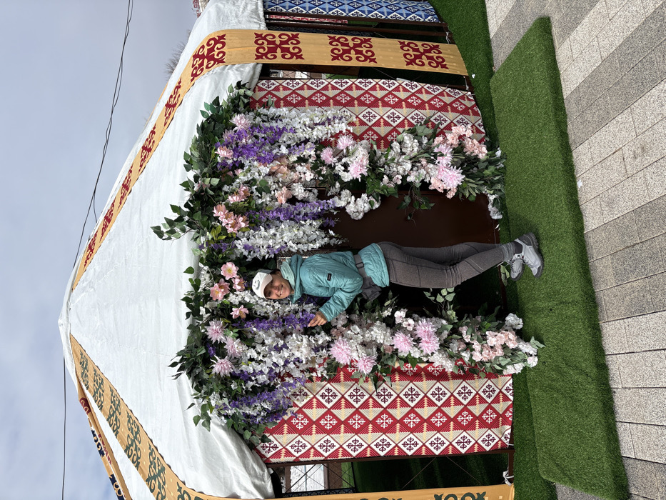 An adult female, wearing a white baseball cap, a light blue quilted jacket, grey leggings, and grey athletic shoes, stands smiling in front of a yurt. Her right hand touches a cluster of artificial purple flowers. The yurt has a white canvas roof and cylindrical walls adorned with traditional Kazakh patterns in red, cream, blue, and gold. The entrance to the yurt is elaborately decorated with an archway of artificial greenery and flowers in shades of pink, white, and purple. Artificial green turf is laid on the paved ground directly in front of the yurt, which is located in Petropavl, Kazakhstan, under an overcast sky.