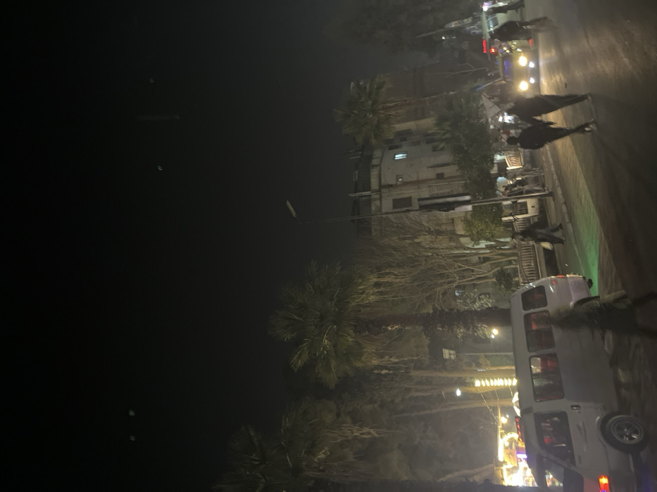 A nighttime street scene is captured, dominated by a dark sky and shadowy structures. Palm trees line the street, illuminated by streetlights and building windows. A white van is parked prominently, with silhouettes of people walking along the sidewalk. Lights from vehicles and buildings blur into the foggy background, giving a sense of depth despite the darkness. The scene evokes a sense of urban life at night.