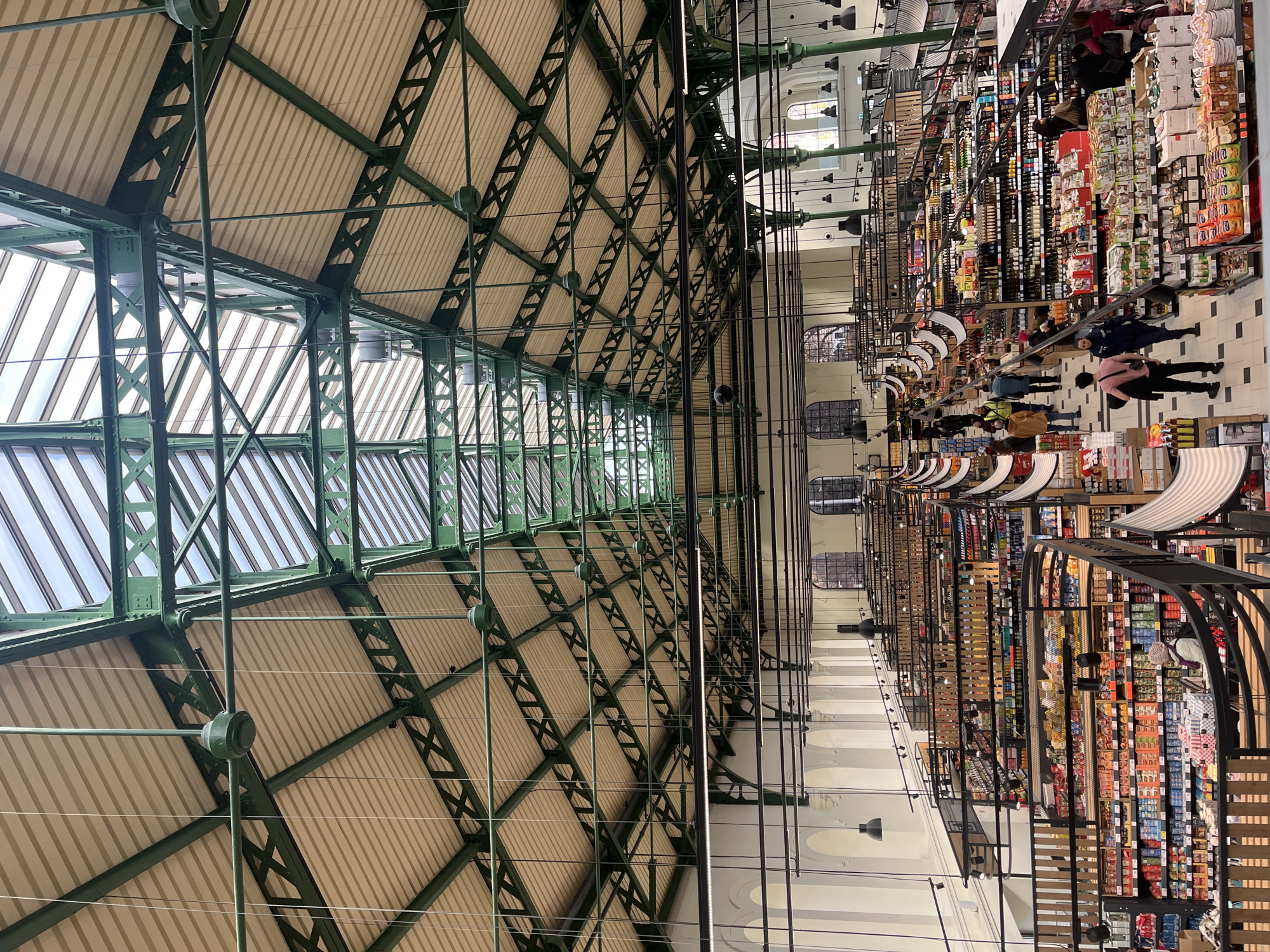 The image depicts the interior of a market hall, likely the Central Sofia Market Hall in Sofia, Bulgaria