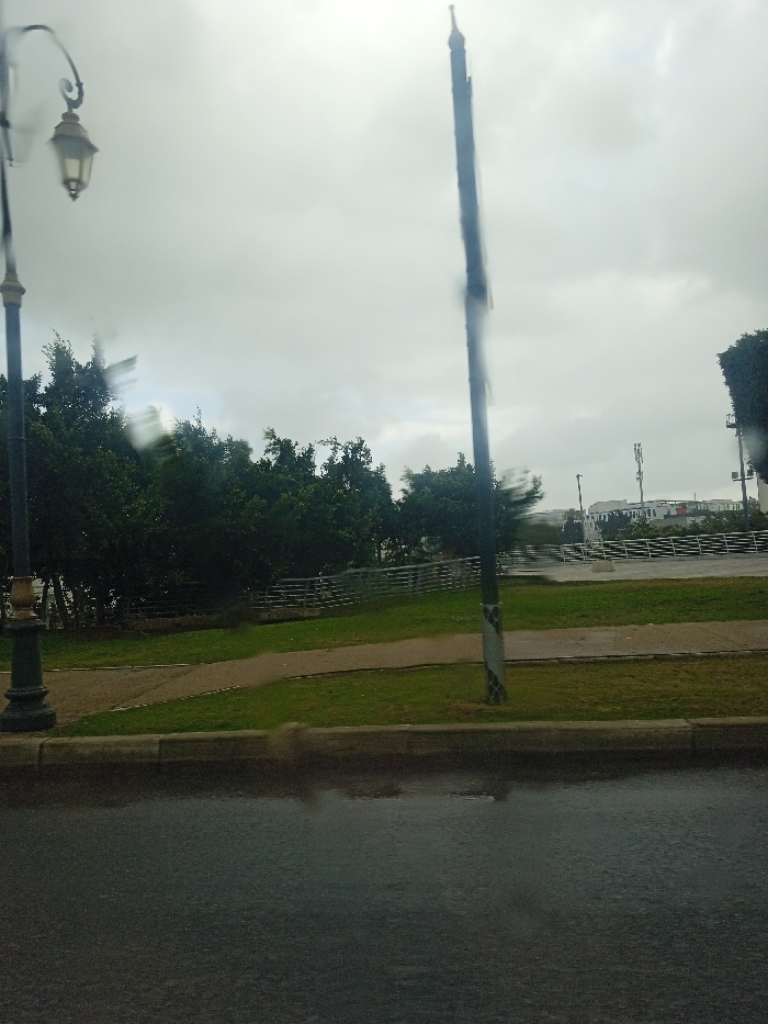 The image depicts a street scene in Salé, Morocco, captured under an overcast sky with evidence of rain on the lens and ground. In the foreground, a dark asphalt road surface is visible, appearing wet with reflections of the sky, indicative of recent or ongoing precipitation. Directly above the road, a raised curb separates it from a median strip or park area covered in green grass, through which a light-colored dirt or paved path curves from left to right. On the left side of the frame, a dark, ornate streetlamp stands prominently, featuring a decorative base and an enclosed lantern-style light fixture. A taller, slender dark pole, possibly another utility or streetlamp pole, is positioned on the right side, partially obscured by raindrops or streaks on the camera lens. In the background, a dense line of dark green deciduous trees forms a natural barrier behind the grassy median. Beyond the trees and to the right, a multi-tiered structure with white or light-colored horizontal railings, possibly a pedestrian bridge or an elevated walkway, spans across the scene. Further in the distance, indistinct white or light-colored buildings are visible beneath the cloudy horizon, with at least two cellular tower antennas distinguishable on rooftops. No individuals or vehicles are visible in the scene. The overall impression is one of a quiet, rainy urban environment.