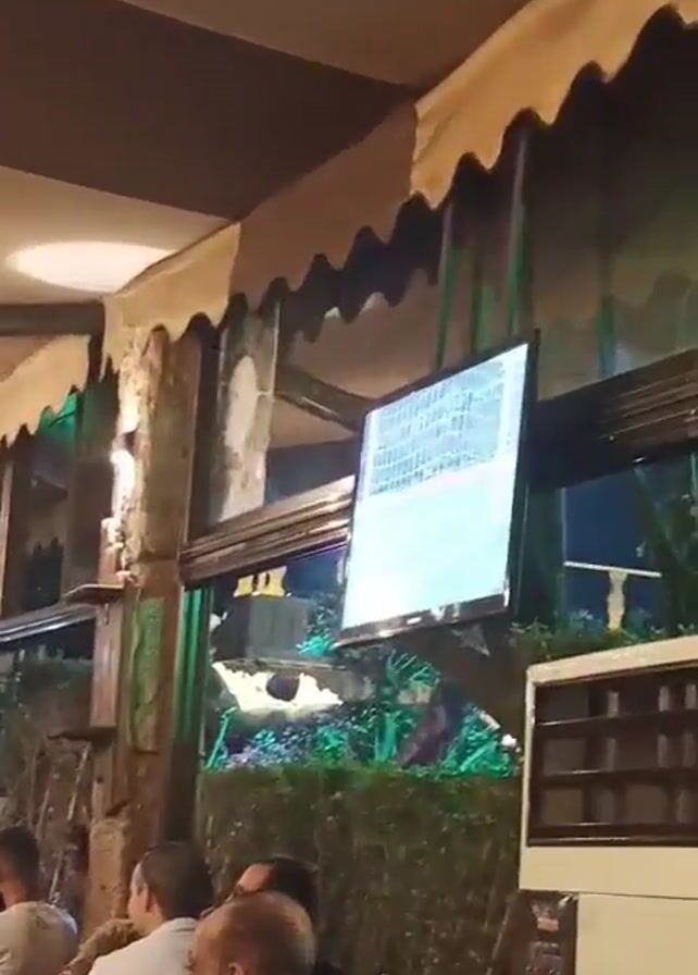 crowded cafe, likely in the evening. Numerous people are seated at tables, seemingly engaged in conversation. Above them, a television screen displays various images, including what appears to be a soccer match and a clip from a movie or show. The cafe has an indoor-outdoor feel with open windows or walls providing a glimpse of foliage outside. A large fan is visible, likely used to circulate air. The overall atmosphere seems lively and social.