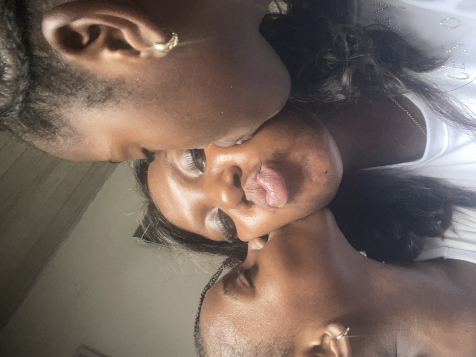 Three individuals of African descent are depicted in a close-up, intimate indoor portrait in Ado, Nigeria. The central individual, with long dark wavy hair, prominent false eyelashes, and wearing a white top with faint text or embellishment, faces forward with puckered lips. An individual on the central person's left is kissing their left cheek; this person has visible braided hair pulled back and wears a small hoop earring. An individual on the central person's right is kissing their right cheek; this person has pulled-back hair and wears a small hoop earring. All three individuals have their eyes closed or mostly closed, emphasizing the affectionate interaction. The background is uniformly light-colored and out of focus.