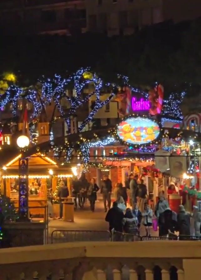Christmas market at night. The market is brightly lit with lights on the trees, buildings, and a large sign that says "Gauffres." There are many people walking around the market, browsing the stalls and enjoying the festive atmosphere. A Christmas tree is visible in the background. The video is taken from a moving vehicle.