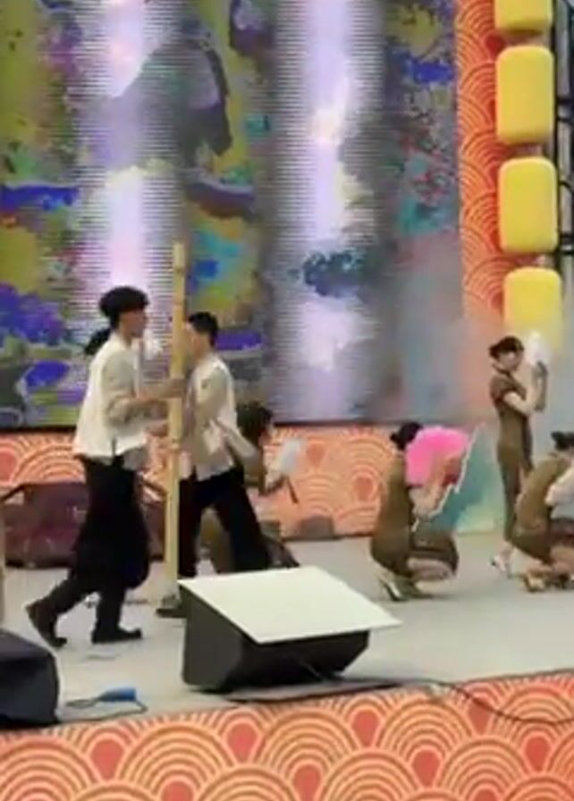 A group of performers is on a stage, performing a choreographed dance routine. The stage has a decorative pattern of orange waves and a large screen displaying colorful, abstract images. There are also several cylindrical yellow decorations to the right of the screen. The performers are dressed in light-colored, traditional-style outfits. Some are holding fans, while others wield long bamboo poles. Smoke effects are visible on the stage, adding to the visual spectacle. Overhead, a lighting rig is set up, and the surrounding environment suggests an outdoor performance venue with trees and structures in the background.