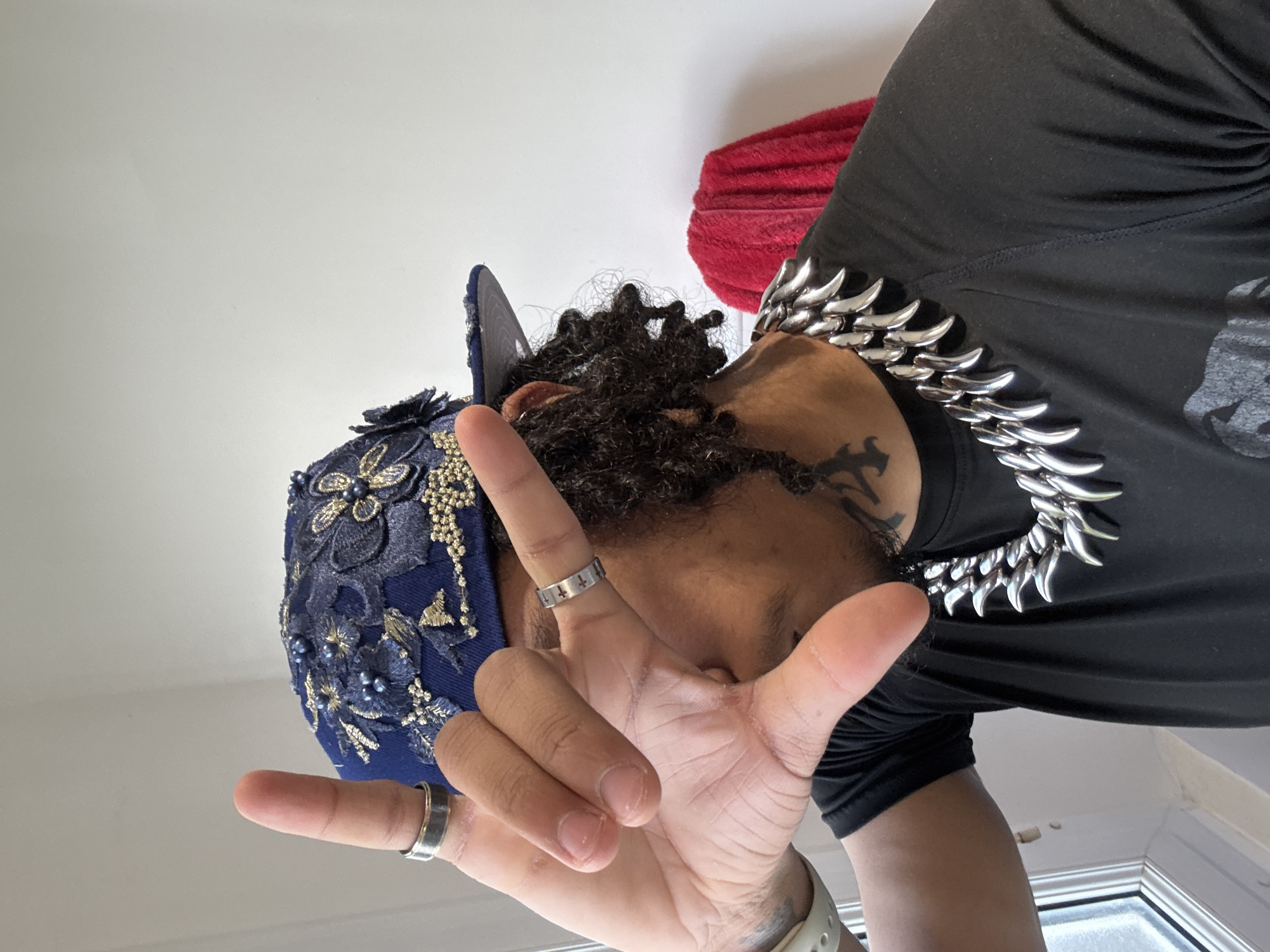 The image depicts an individual indoors in Massy, France. The person's right hand is raised, partially obscuring their face. A plain silver band is worn on the ring finger, and a silver ring with small cross-like engravings is on the index finger. The individual wears a dark blue cap adorned with gold floral embroidery and blue bead embellishments. Dark, curly hair is visible beneath the cap on the right side of the head, and a stylized dark tattoo is present on the right side of the neck. A prominent silver-toned necklace, composed of large, alternating claw-like or spike-like links, rests over a black short-sleeved t-shirt. A light-colored wristband is visible on the left wrist. The background consists of a plain white wall, with a segment of a white multi-paned window frame visible on the left and a red folded fabric item hanging against the wall on the right.