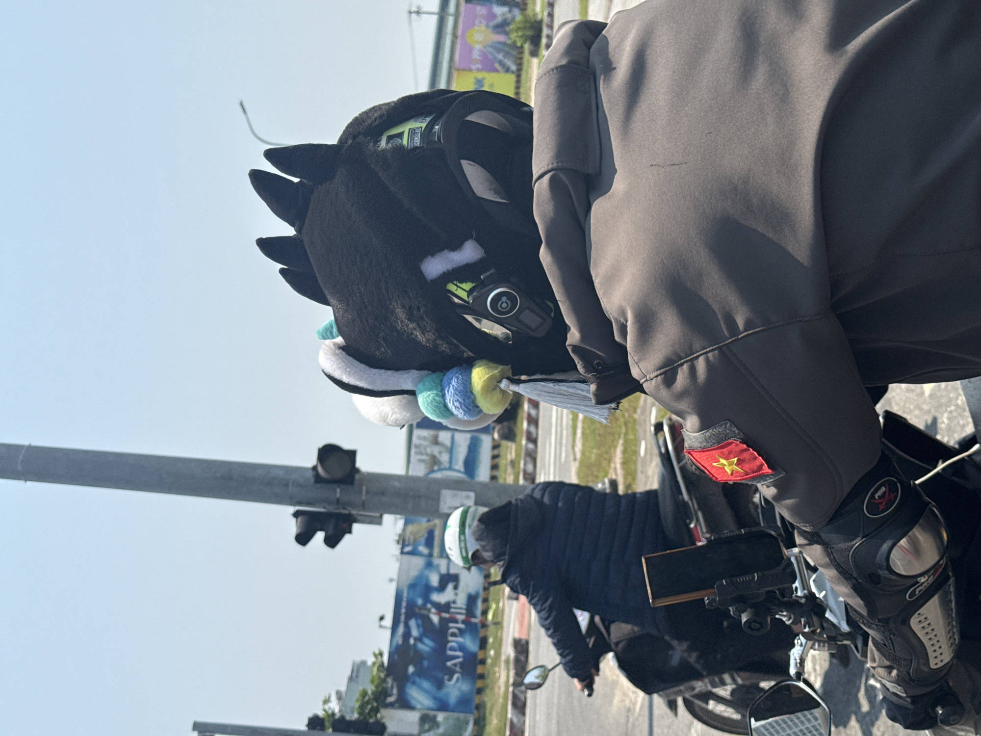 motorcycle rider wearing protective gear, including a black helmet adorned with decorative plush features, knee pads, and gloves. A red patch with a yellow star, resembling the flag of Vietnam, is visible on the rider's sleeve. Another person on a motorcycle is positioned slightly ahead, also wearing a helmet and dark jacket. The background includes a traffic light, buildings, and a large sign with the word "SAPPHIRE" on it. The scene appears to be in an urban area in the city of Đà Nẵng, Vietnam.