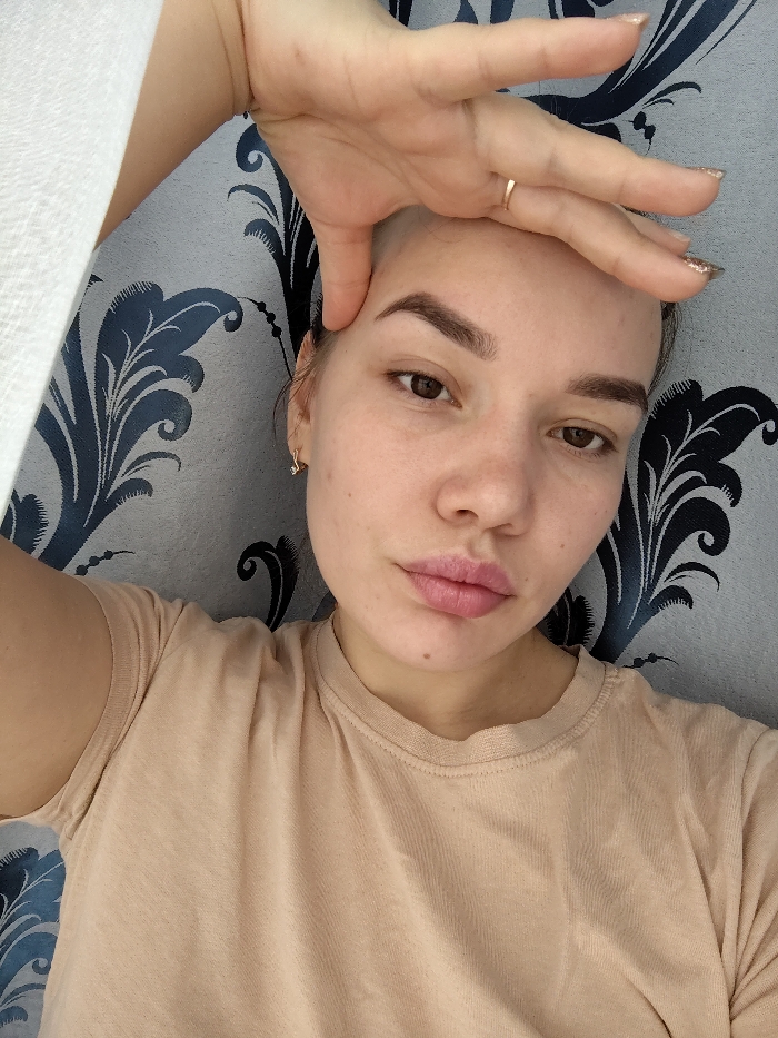 A young woman takes a selfie against a gray-blue floral wallpaper. She's wearing a beige t-shirt. Her brown hair is pulled back. She has light skin, brown eyes, and full lips. Her eyebrows are well-defined. A gold ring adorns her ring finger. Her hand rests on her forehead. She is not wearing any makeup.