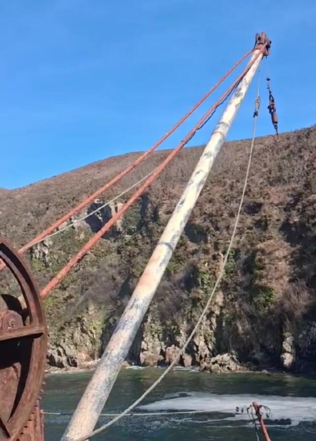 close-up of an old, rusty crane mechanism against a bright blue sky and a hilly, rocky coastline. The crane features a large, toothed gear wheel and a boom supported by wires. The boom extends over a body of water, with white foam visible on the surface. The crane appears weathered and inactive.