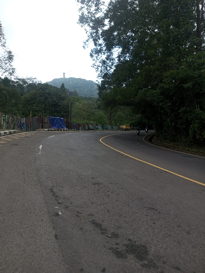 The image depicts a two-lane asphalt road curving to the right through a rural or semi-rural mountainous area, located in Gubbisamamidi, India. The road surface is dark gray with visible wear, featuring a solid yellow line on the right side and a faded broken white line on the left, indicating a merge or turn. On the left side of the road, a low concrete barrier with visible graffiti art is present, followed by a corrugated metal fence exhibiting some rust. Behind this fence, a large object is partially covered by a blue tarp. Dense green vegetation and trees rise sharply behind the fence, extending up a hillside. In the distance on the left, utility poles and power lines are discernible among the trees. The right side of the road is bordered by thick, dark green foliage and trees, forming a natural wall. A small drainage ditch runs between the road edge and the vegetation. In the midground, further along the curved road, a light-colored (possibly yellow) dump truck or utility vehicle is present on the left side of the road. Two dark-colored motorcycles, each with a rider, are visible traveling away from the viewer on the curved road ahead of the truck. The background is dominated by a large, tree-covered mountain or hill. A prominent communication tower, along with an adjacent smaller structure, is clearly visible on the mountain's summit. The sky above is overcast and light gray. The overall lighting is diffused, suggesting an overcast day.