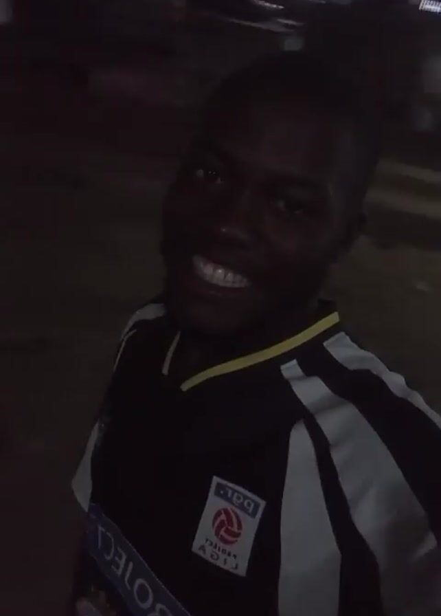 At night, a man in a black and white jersey stands facing the camera. The jersey has a yellow collar and a logo on the chest. The man's face is visible, and he appears to be speaking. The background is dark, with some visible lights suggesting a street or outdoor area. The camera moves slightly, then pans to the side, showing a dark outdoor environment with blurred figures in the distance. The light is very low, making details difficult to discern.