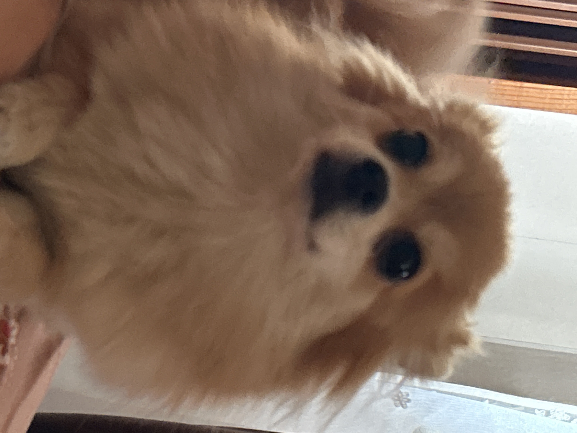 The image displays a small, light-tan to light-brown fluffy dog, likely a Pomeranian, positioned centrally and facing directly towards the viewer. The dog has prominent dark, circular eyes and a dark, indistinct nose. Its voluminous fur obscures its mouth and body contours, though its front paws are faintly discernible at the bottom center. The background is out of focus, revealing vertical wooden elements to the upper left and a white curtain with a faint pattern to the upper right. A blurred, orange-pink surface is partially visible in the bottom right foreground. The scene is located indoors in the city of Varshets, Bulgaria.