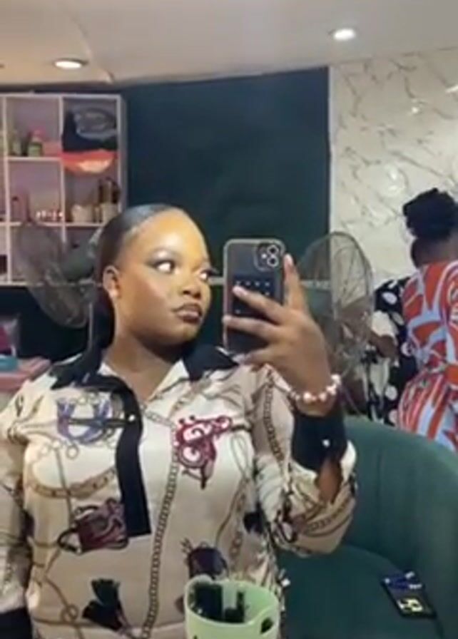 A woman takes a selfie in a mirror. She has dark hair pulled back, is wearing a patterned shirt with pearl bracelet, and has on makeup. In the background there is a shelving unit with assorted items on the shelves, a tall fan, and other people are visible in the mirror. There is a table in the foreground with makeup.